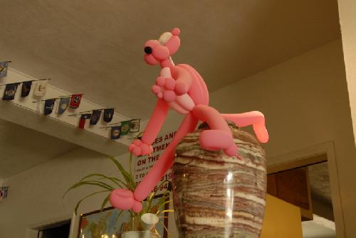 Pink panther balloon sculpture done by an itinerant street artist who was staying at the Boulder International Hostel and left a sample of his work on a large onyx vase on the front desk.